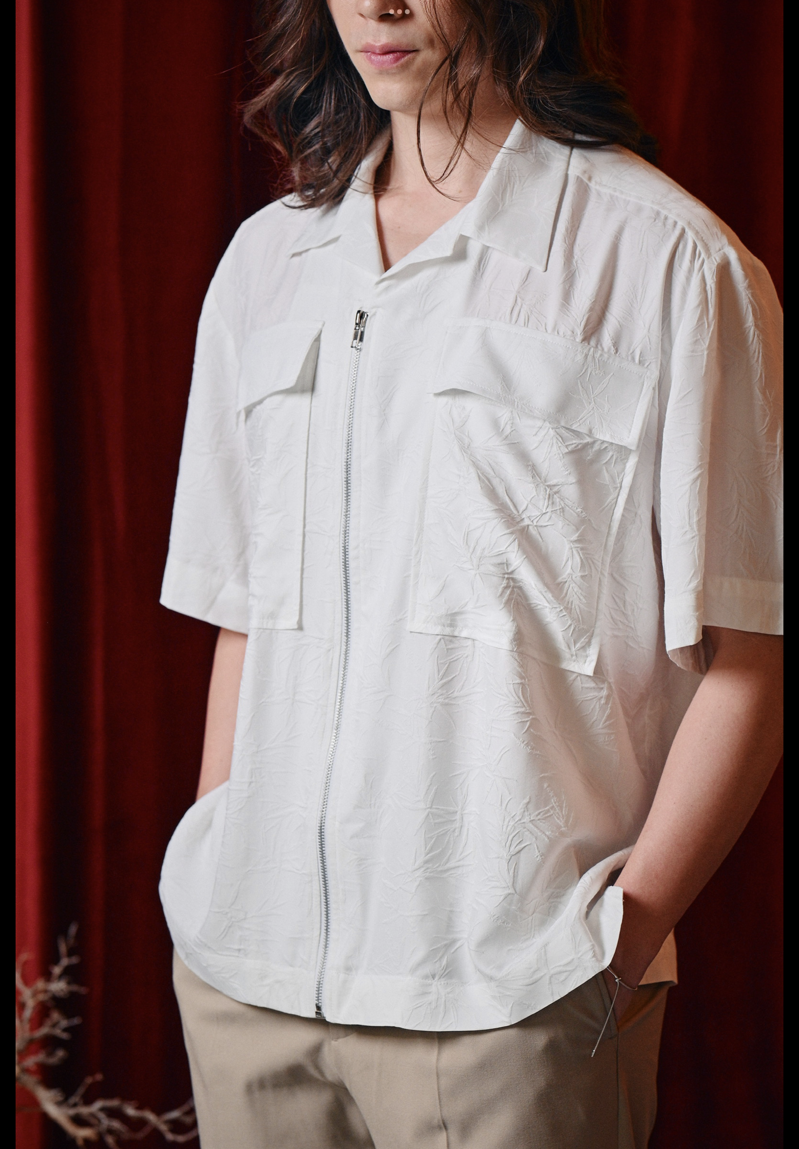 Fù bamboo motif jacquard zip front shirt